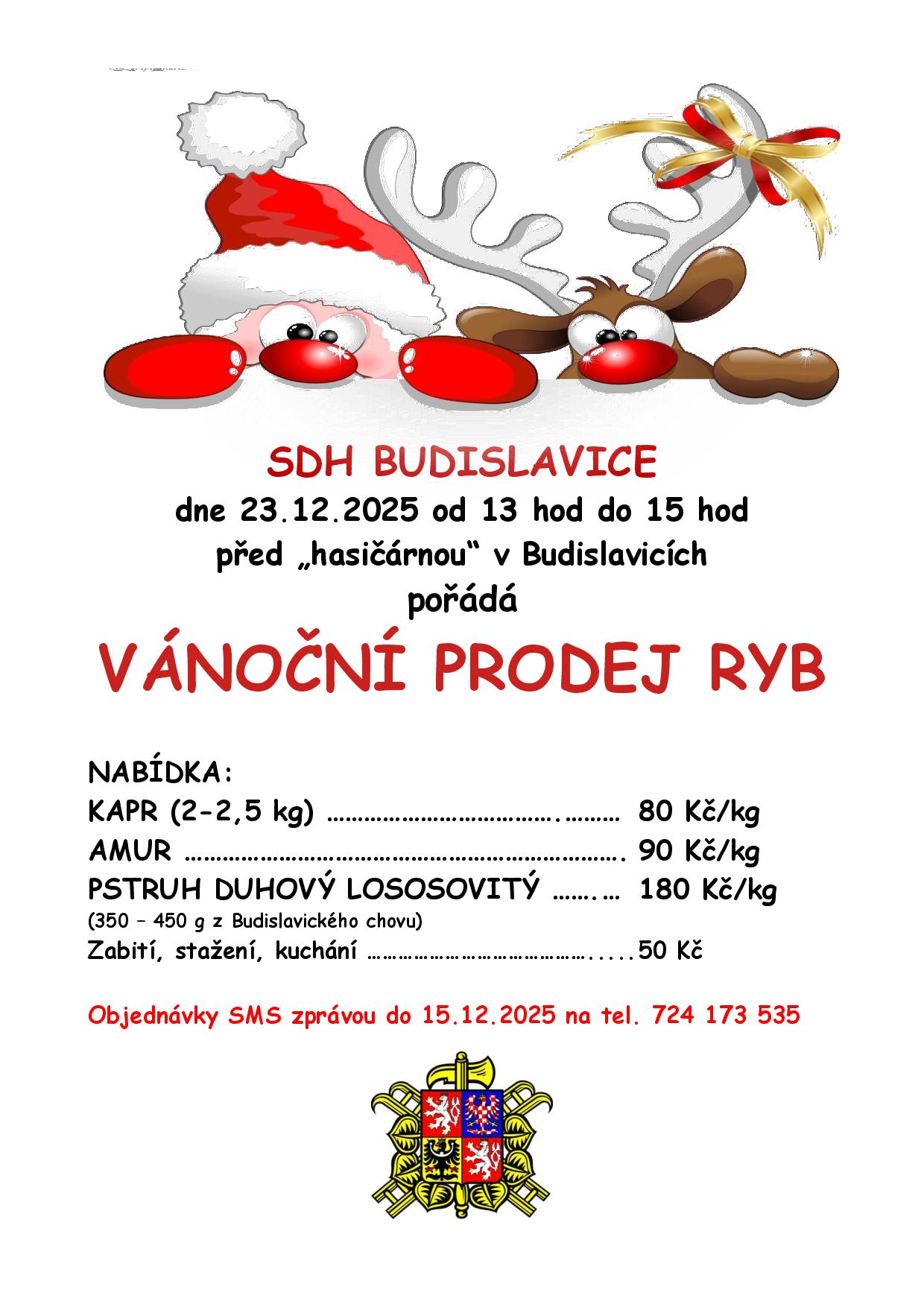 Vánoce se blíží a jako každý rok pro vás s členy našeho SDH Budislavice budeme pořádat vánoční prodej ryb, pstruzi jsou navíc přímo z našich vlastních domácích sádek. Prodej probíhá tak, že si předem objednáte počet ryb a jejich úpravu (telefonní číslo na plakátu). My je zajistíme a 23.12. dopoledne připravíme, aby byla zaručena maximální čerstvost. Živé ryby dovezeme v kádi. Každému připravíme tašku se jménem a vy si pak svoji objednávku jen vyzvednete před hasičárnou dne 23.12. od 13-15h, bez front a čekání. Podpoříte tím činnost SDH Budislavice, ušetříte si práci a můžeme před Svátky prohodit pár slov u teplého čaje nebo svařáku.
